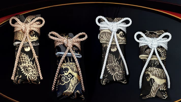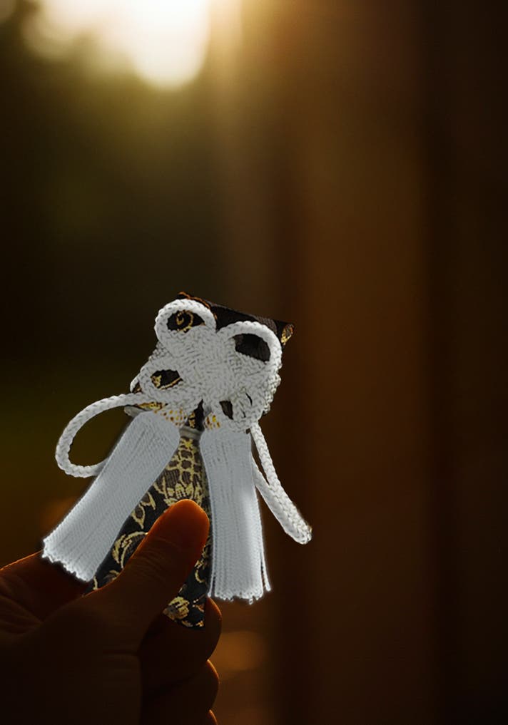 「御守型ひとふり」を包む刀袋は、京都西陣織の反物から制作され、日本の伝統の奥ゆかしさと高級感が漂います。本物の日本刀を入れた時と同じ結び、そして懐剣を入れた際に見られる菊結びを再現しています。