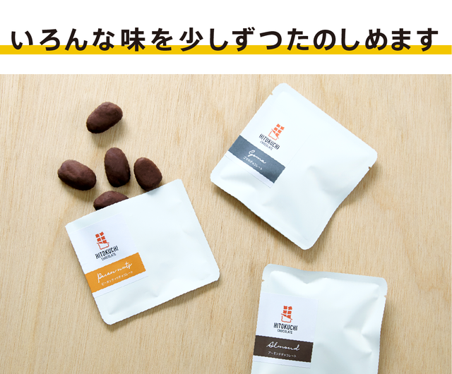 サクサククレープのチョコレート(2個入)、ごまのチョコレート(2個入)、飴がけアーモンドのチョコレート(2個入)、アーモンドチョコレート(35g入)、ピーカンナッツチョコレート(30g入)の5種類をそれぞれ3袋ずつお届けします。