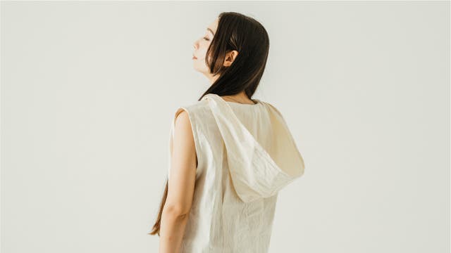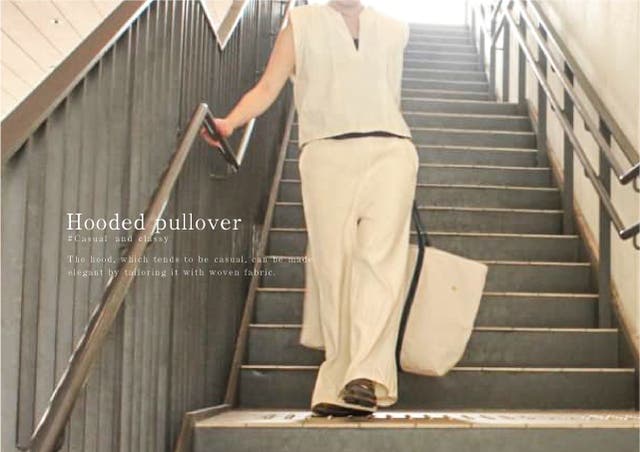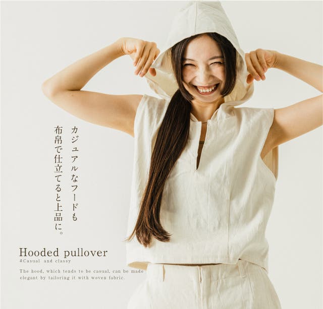 ついついカジュアルになってしまうフードも布帛で仕立てると上品に。