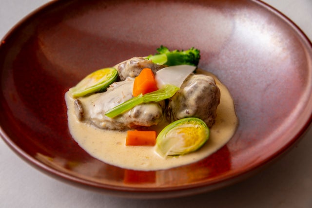 さらに、仔牛のブイヨンで肉を煮込むとき、ミルポワ(香味野菜の角切り)と香辛料を布で包み、うまみだけをスープに移し、焦がさないように弱火でじっくり煮込むことで風味が豊かな純白のクリーム煮が誕生します。