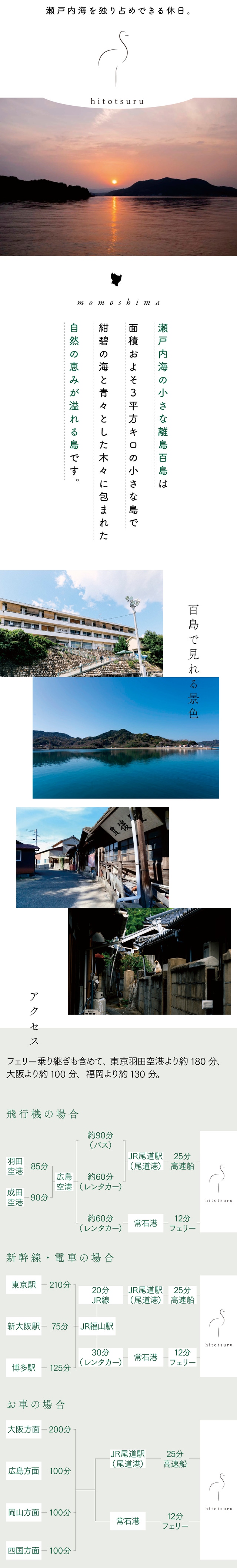 瀬戸内に浮かぶ離島、百島。かつてこの小さな島に長く続いた島唯一の商店「ヒトミセ」がありました。2020年、「ヒトミセ」のおもてなしの心を受け継ぎ、新たに宿「ヒトツル」として生まれ変わりましました。