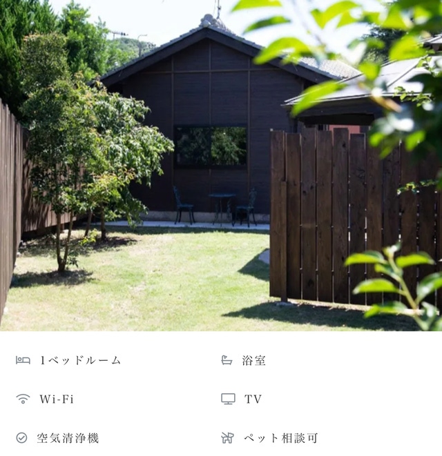 トイレ(1階と2階に各1)、お風呂、ダイニングスペース、ドライヤー、テレビ、冷蔵庫、エアコン、ガゼボ(本館・別館共同・バーベキュー設備)売店、タオル、スリッパ、部屋着、アメニティ(歯ブラシ、シャンプー、リンス、ボディーソープ)