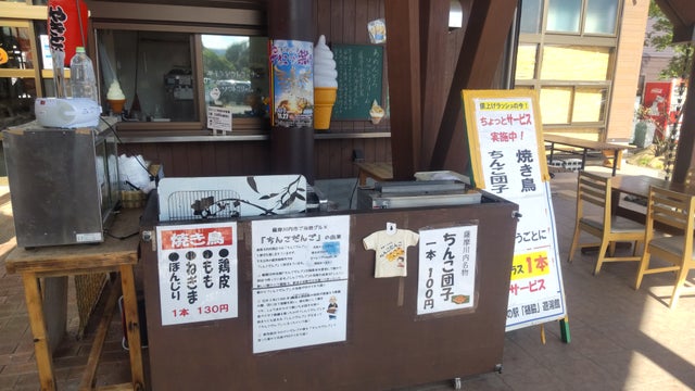「焼き鳥」や「ちんこ団子」をその場で焼いております。「ちんこ団子」は新米の粉(しんこ)をお醤油で絡めて焼いた香ばしいお団子、しんこ団子が訛って、当地では「ちんこ団子」として親しまれております。日曜や祝日などは、焼くのが追い付かないくらいです!