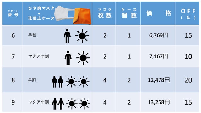 ひや爽マスクと珪藻土ケースについてサイズ別数量別にリターンメニューをご用意いたしました。リターン数が多いですが、ご希望のリターン番号をご参考にいただき、ご支援メニューをご検討いただければと存じます。