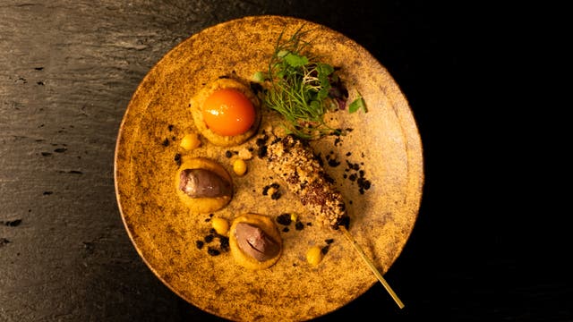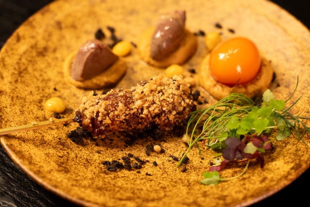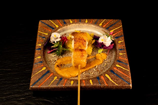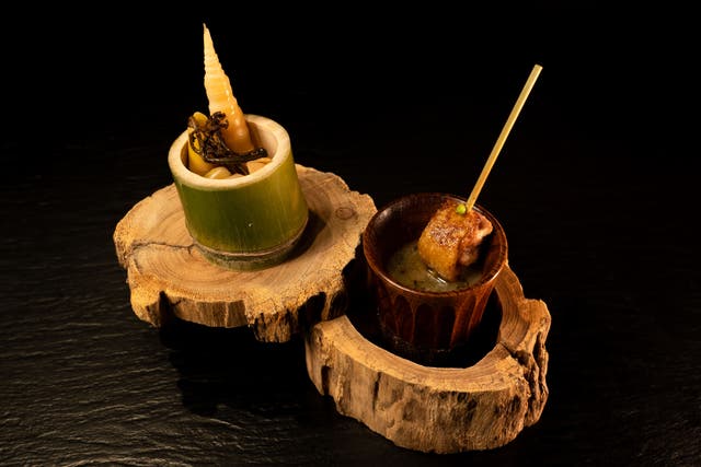 -中東に行った際に感じた、日本の素晴らしさの一つ、里山里海の文化。私たちのルーツの一つである月山の香りを地鶏に纏わせながら愉しむ一皿です。-