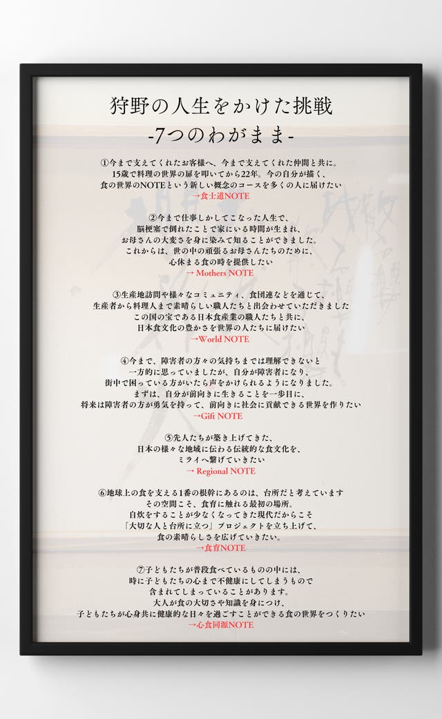 自分だったら飲食業界を諦めていると思います。しかし狩野さんより「NOTEコースを実現したい」と言葉にされた時「覚悟」と「芯」を感じた。そこからエンジンがかかった気がしてます。最終的には「NOTEのコース」世の中に大きなインパクトを与えたいと思っております。