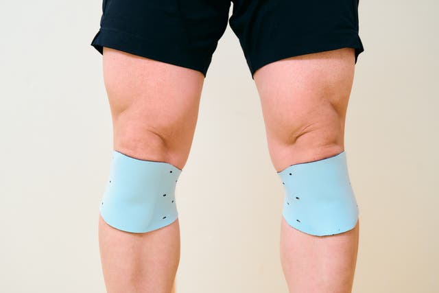 この膝用サポーターは、通常の膝用サポーターに比べ、膝の部分のパッドを大きくし、膝にざぶとんをつけているような安心感を感じていただける設計になっているため、「ひざぶとん」と名付けました。(モデル:S-M着用)