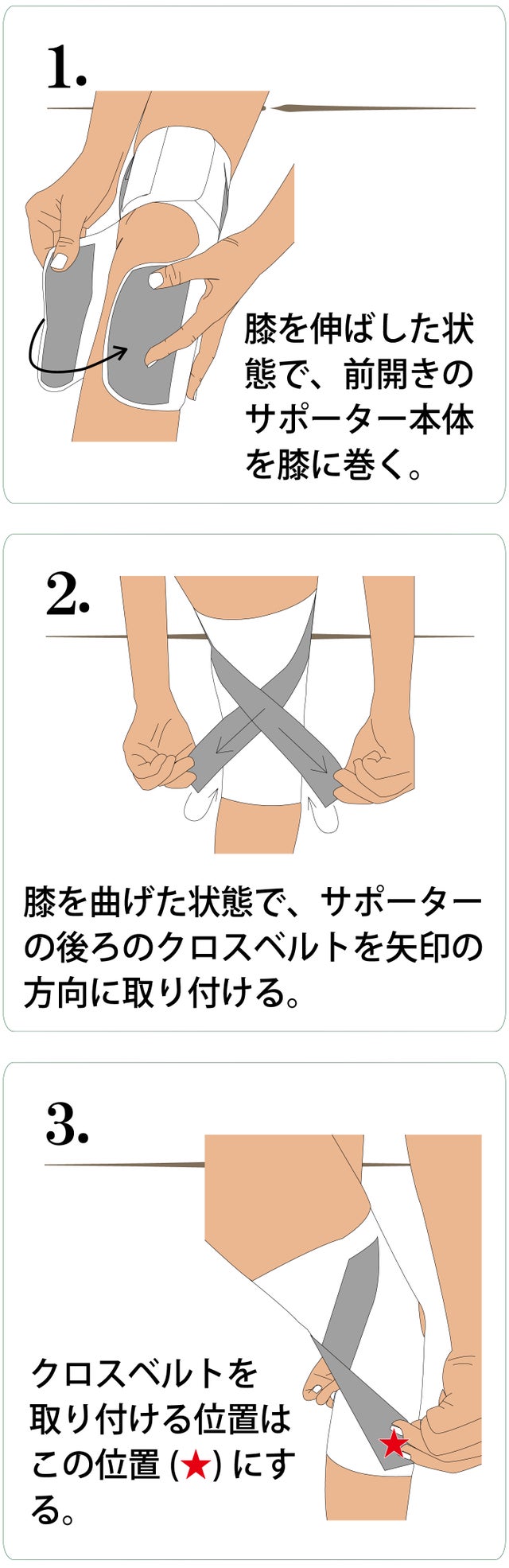 膝伸展制限のための伸縮性クロスベルトにより、歩行時に強制的に下肢の筋肉を働かせて、主に下肢の筋肉の収縮力により体重支持を行うことで、下肢の骨(膝関節)にかかる負担を軽くしました。
