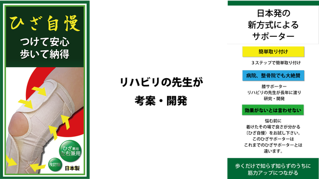 ひざ自慢はリハビリの先生が患者様と一緒なって研究・開発した転倒防止型ひざサポーターです。