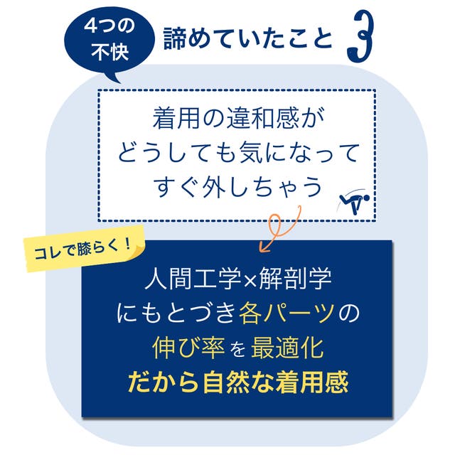 膝サポーター着用時に「イヤだな」と感じて「もう使わない!」となる4つのストレスを、ひざ楽サポーターは一挙に解消しています!
