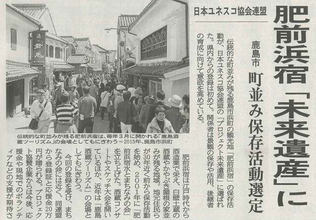 伝統的な街並みに対する保存活動が評価され、肥前浜宿の保存活動は日本ユネスコ協会連盟の「プロジェクト未来遺産」に選ばれました。