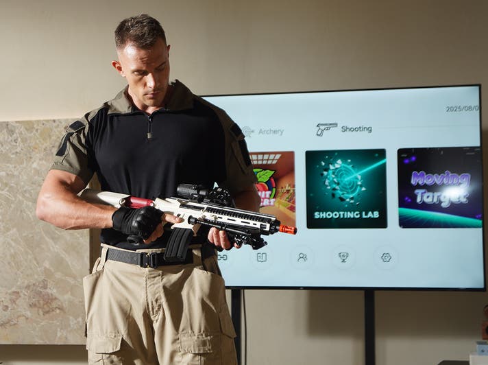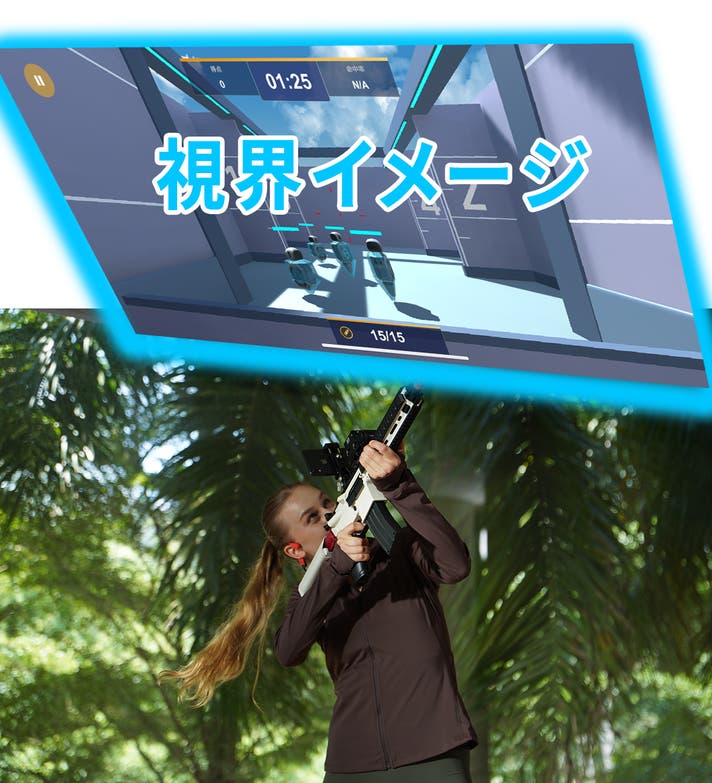 BB弾も飛ばさずにリアルな電動リコイルショックのあるライフルを撃っている感覚のまま、安全なシューティングゲームが実現しました。