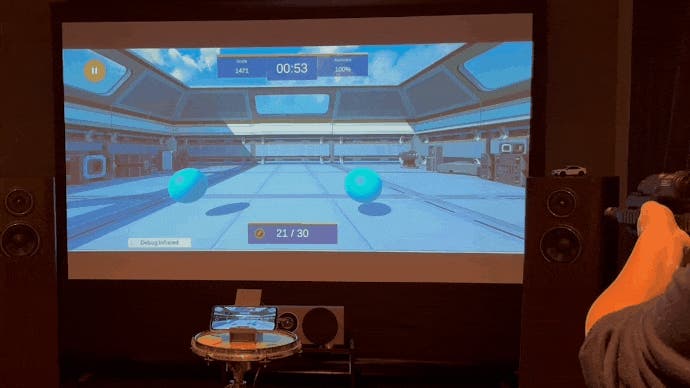 スマホアプリ画面をTV画面に無線転送してTV画面をターゲットにして射撃。