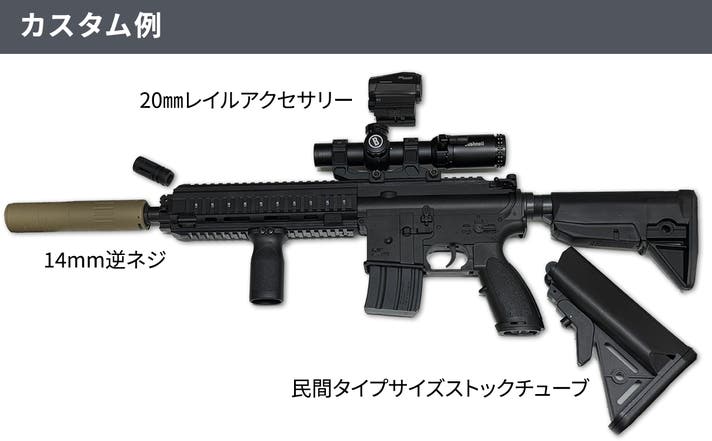 ※カスタム例です。スコープ、ドットサイト、サプレッサーなどは付属品ではありません。規格を参考にご手配下さい。
