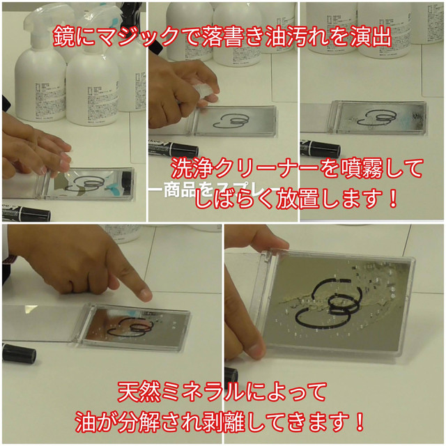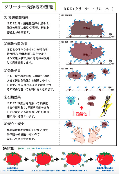 成分は主に天然ミネラルが主で、その様々な鉱物抽出物と植物性抽出ミネラルが還元作用を繰り返し汚れを分解します。油分(鉱物油・植物油・動物油)を吸着分解させる機能を持ち抗菌・防臭効果を持ち合わせています。界面活性剤等を使わなくても、浸透力が優れているので素早く細部に浸み込み汚れを分解し浮き上がらせ落とします。古い汚れや諦めていた汚れ、シミ抜き、脱脂に、また酸化した油汚れなどにも 効果を発揮します。菌を除去してスッキリ消臭。