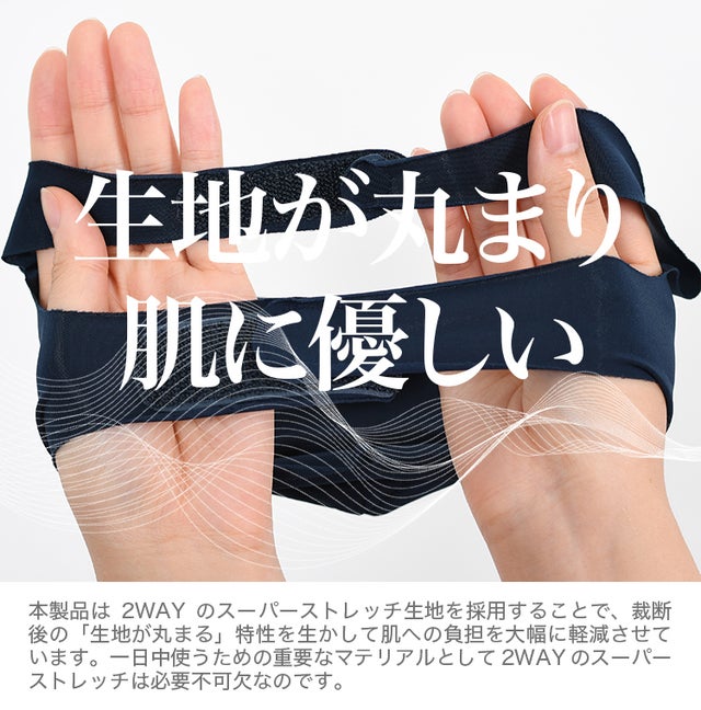 耳にかけるのではなく頭の後ろで止めるため、耳が痛くなりません。裁断箇所が丸くなるというストレッチ素材の利点を生かし、耳に当たっても不快感や痛みを生じない仕様となっています。まるで着けていることを忘れてしまいそうなほど、自然な着け心地が体感できます。