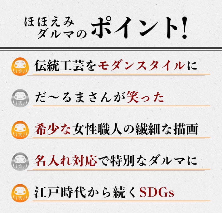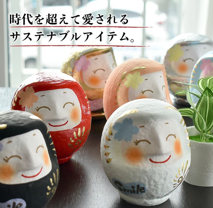 伝統の技を受け継ぎつつも、繊細な表情の表現や色使いに新たな工夫を加えることで、これまでのだるまとは一線を画す“新しい形”を追求し、今の時代にフィットする「笑顔のダルマ」をお届けしたいと思っております。