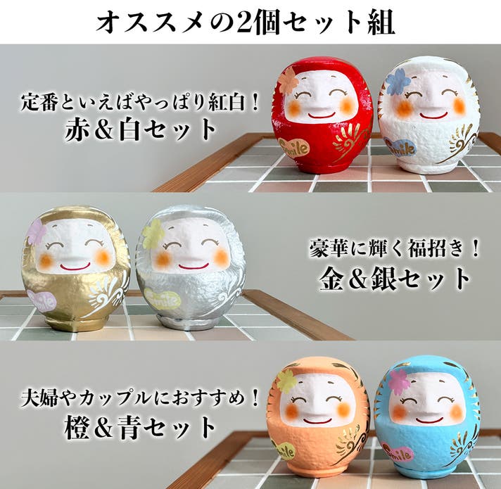 ほほえみダルマ7色のうちお好きな色を2個お選びいただけます。