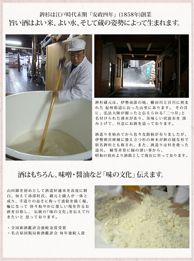 河武醸造は、伊勢南部の地、櫛田川と宮川に挟まれた紀州街道に沿った山里にあります。その昔に、弘法大師が掘ったと伝えられる「二つ井」と名付けられた湧水があり、美味しい伏流水を汲み上げて、丹念にお酒を造っております。