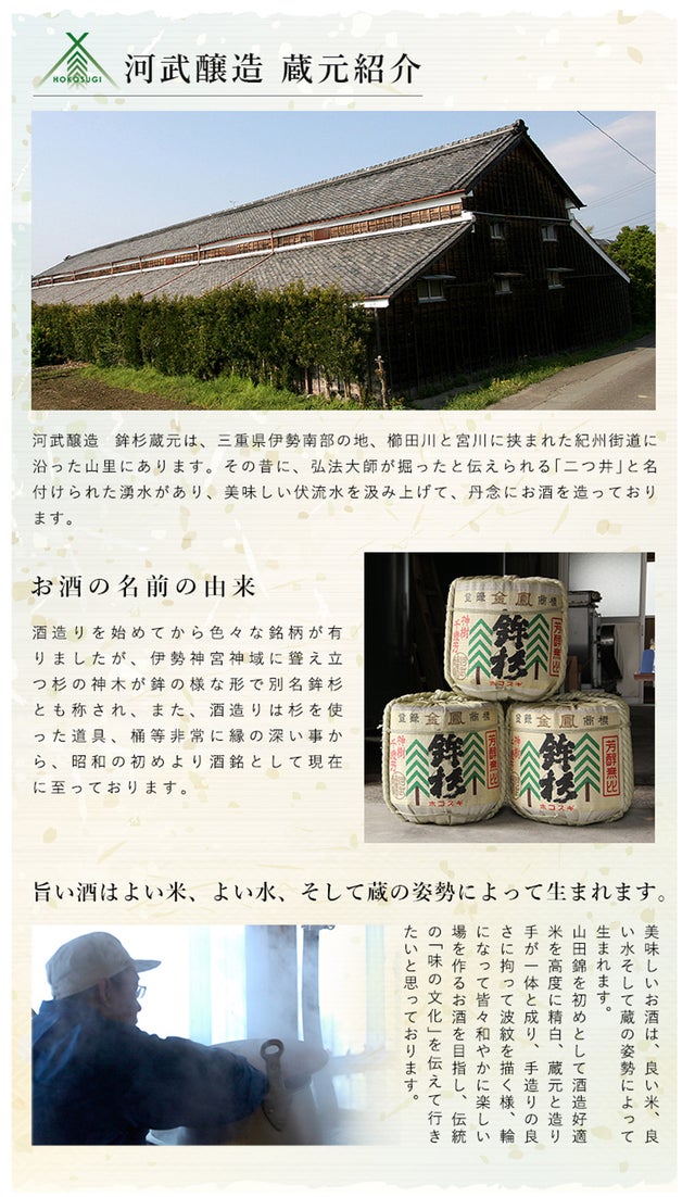 我々河武醸造は、伊勢本街道、和歌山別街道、熊野街道が通過する交通の要地として発展してきた自然豊かで穏やかな町、三重県多気郡多気町にて、安政四年(1857年)から続く歴史ある酒蔵です。
