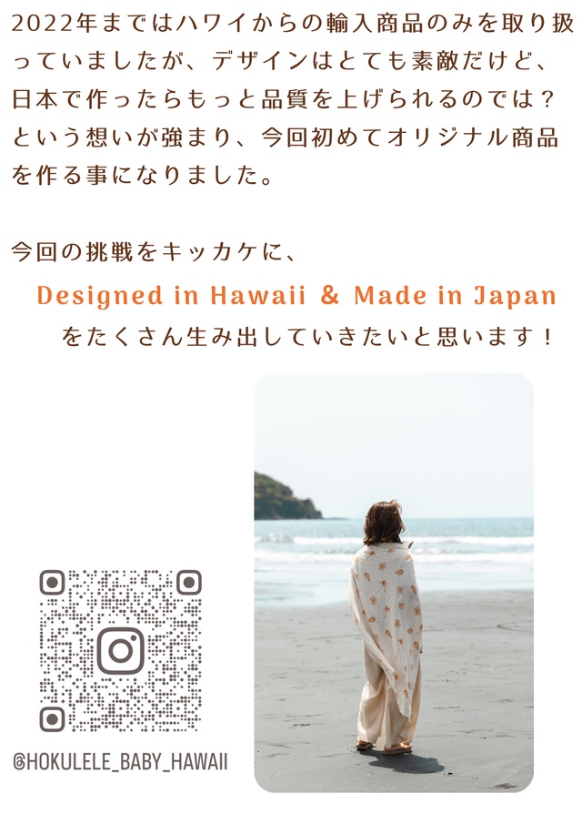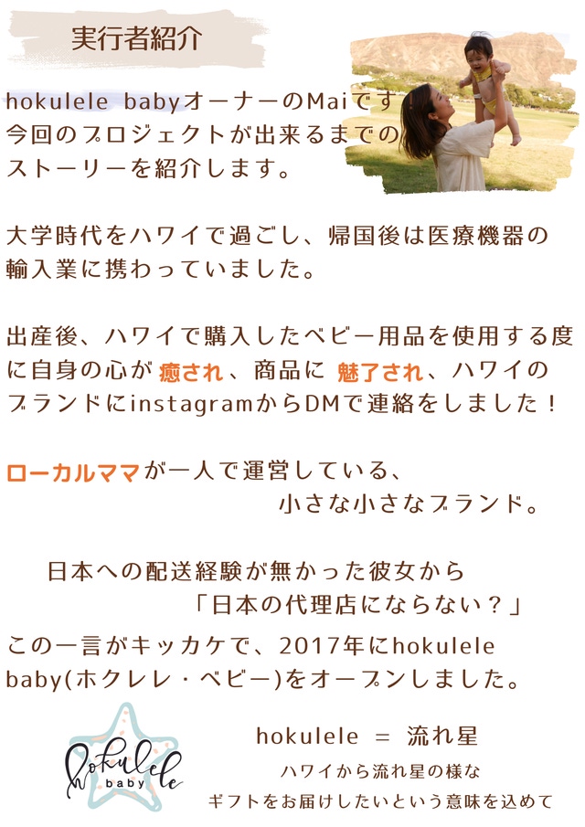 「Makuake(マクアケ)」は、実行者の想いを応援購入によって実現するアタラシイものやサービスのプラットフォームです。このページは、 プロダクトカテゴリの 「ハワイからすべてのママ・パパへ。日本製オーガニック100%のベビーアイテム」プロジェクト詳細ページです。