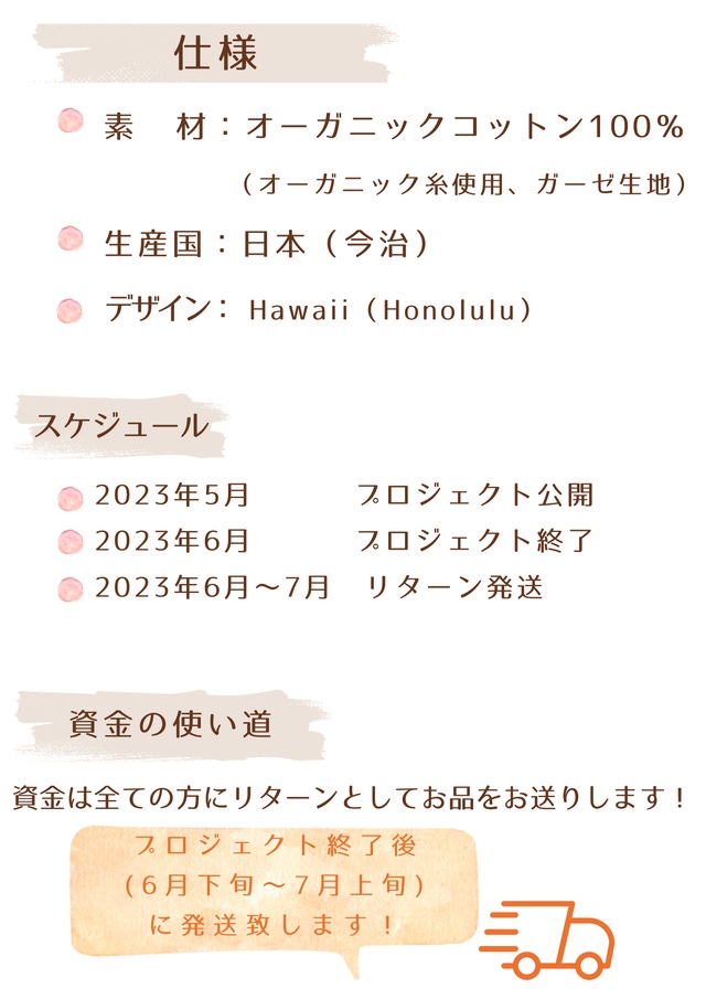 〈製造元〉株式会社オルネット 〈販売元〉株式会社エグゼキューション ■価格について 応援価格は、本体価格に送料も含めまれた価格表示となっております。プロジェクト終了後、弊社オンラインサイトにて表示される価格とは差異がございます事、ご了承ください。 ■取り扱い方について ・毛羽立ちやパイル抜けを防ぐため、柔軟剤のご使用は避け、洗濯ネット・くず取りネットのご使用をお勧めします。 ・ガーゼやタオルを振り回したり、強くはたくと引き裂ける可能性がございます。特に縫製部分は引き裂けやすいので、ご注意ください。 ・デリケートな素材のため、節水モードでのお洗濯や塩素系漂白剤・蛍光増白剤の配合された洗濯のご使用はお避けください。 ・濃色品は色落ちする場合がありますので、単独洗いをお勧めします。 ・過度な高熱による乾燥(タンブラー乾燥等)は生地を傷める可能性があります。 ■出荷状況について プロジェクト終了後の配送となります事をご了承ください。 ■商品の使用について おくるみをご使用頂く際には呼吸確保のため、顔にかからないようご注意下さい。 商品の誤飲にはご注意下さい。 ※本文中に記載させていただいたスケジュールは、あくまでプロジェクト公開時点の予定です。応援購入の性質上、配送遅延のおそれがございます。 ※原則として、配送遅延に伴う応援購入のキャンセルはできませんが、リターン配送予定月から6ヶ月を超えた場合には、希望者に限りキャンセルにて対応させていただきます。