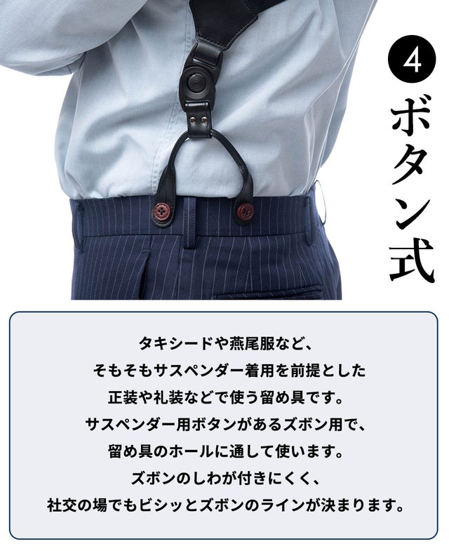 サスペンダーを肩に回して装着した後、ズボンのフロントかサイドに留め具で固定してください。