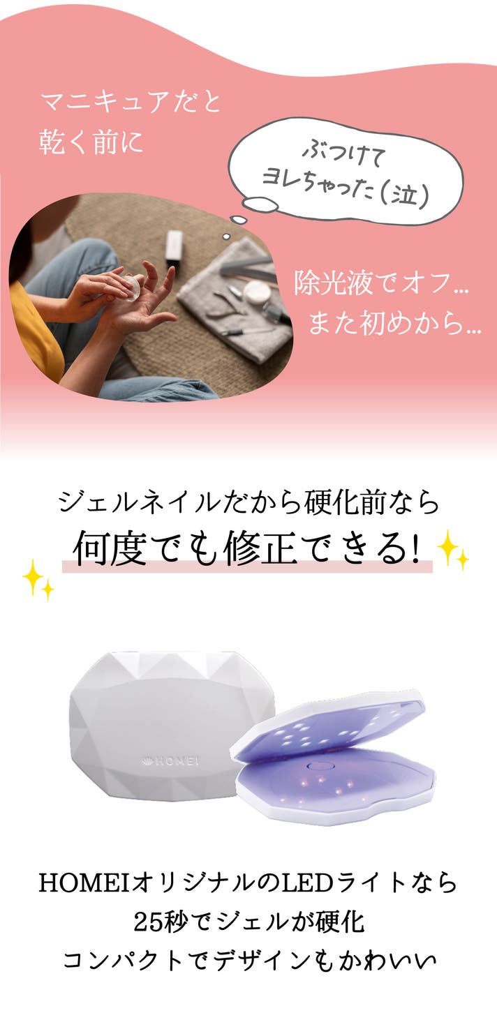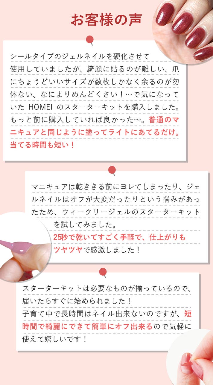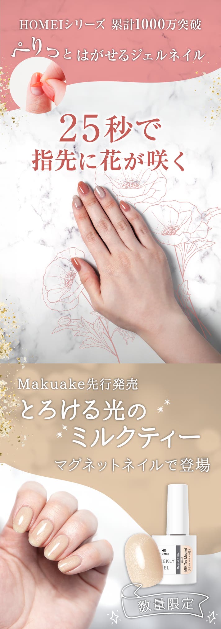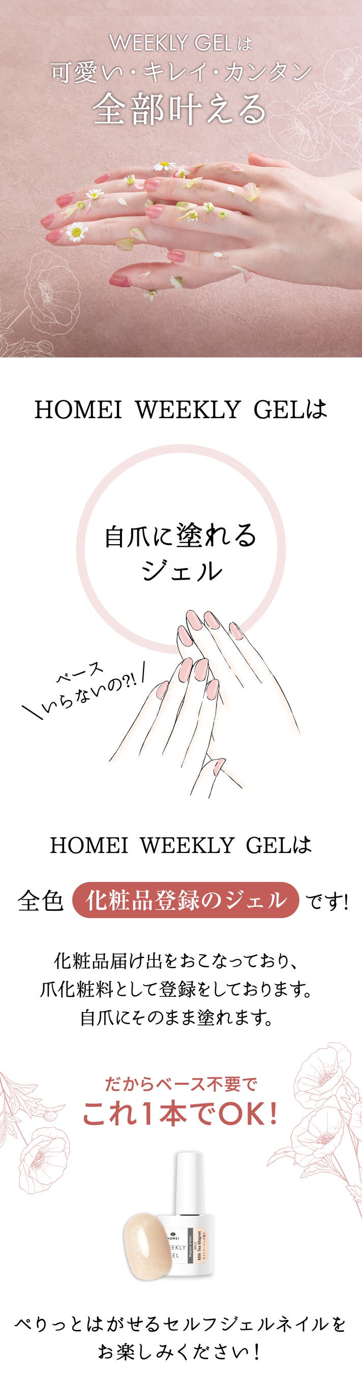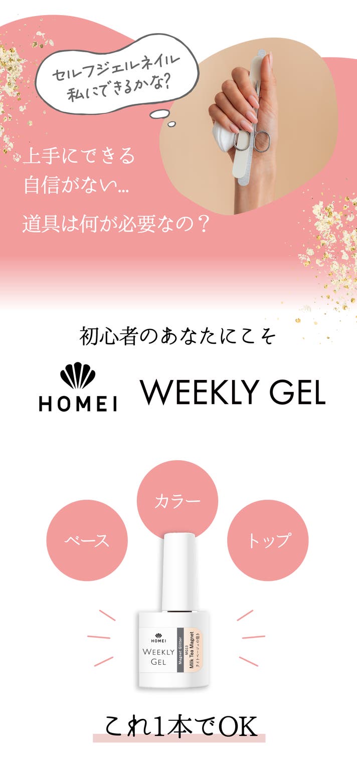 ポリッシュの商品を発売していましたが、それだけはセルフネイルの悩みを解決できない。そんな悩みを解決するために開発されたのが、HOMEIウィークリージェルです。
