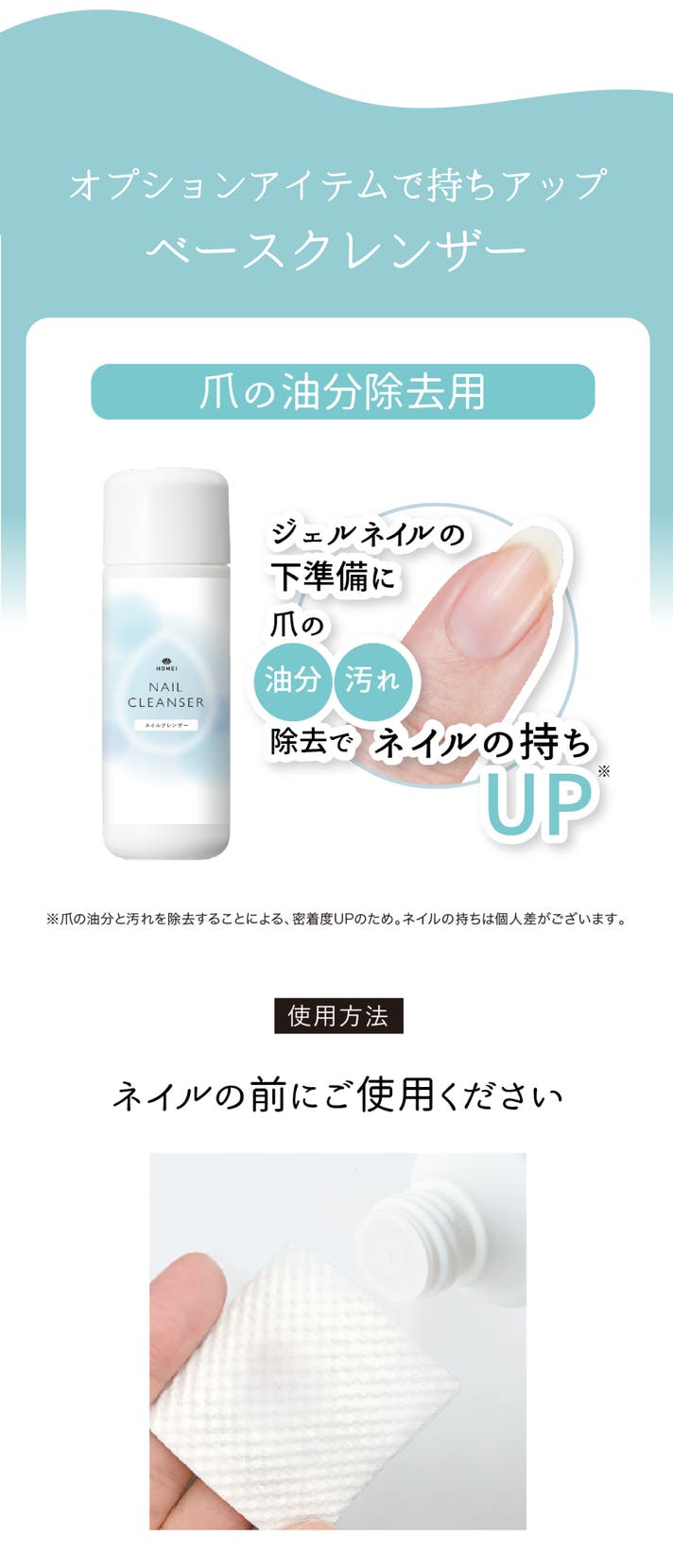 ネイルクレンザーをキッチン用ペーパー等に含ませ、爪の表面、甘皮付近、際(サイド)、先端(エッジ)、先端の裏側まで、しっかり油分と汚れを拭き取ります。処理後の爪は触らないでください。