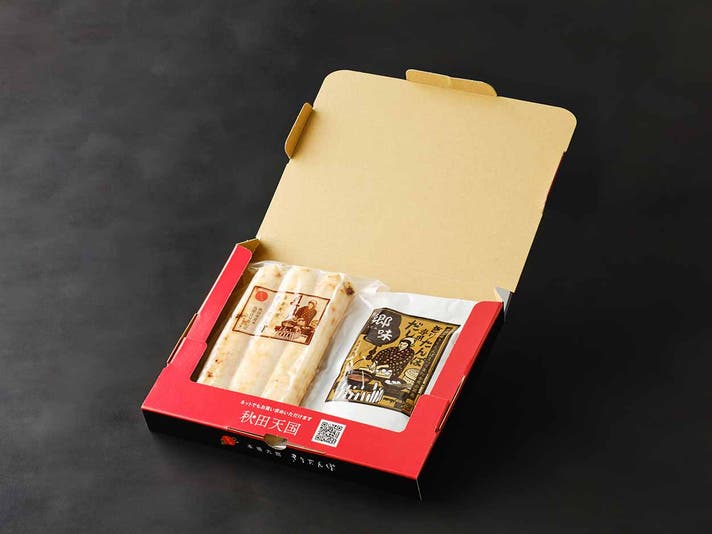 商品の蓋を開くとこんな感じです。「肉厚きりたんぽ」と、「きりたんぽ専用だし郷味:さとみ」がセットになった、きりたんぽ鍋の基本セットです。具材は入っておりませんので、お客様がお好みで買い足す必要がありますが、このセットがあれば本場のきりたんぽ鍋の味をご自宅で楽しむことが出来ます。(もらった方が、「私も買いたい!」と思った時にすぐ対応できるよう、弊社のネット通販(秋田天国)のQRも付けました。)