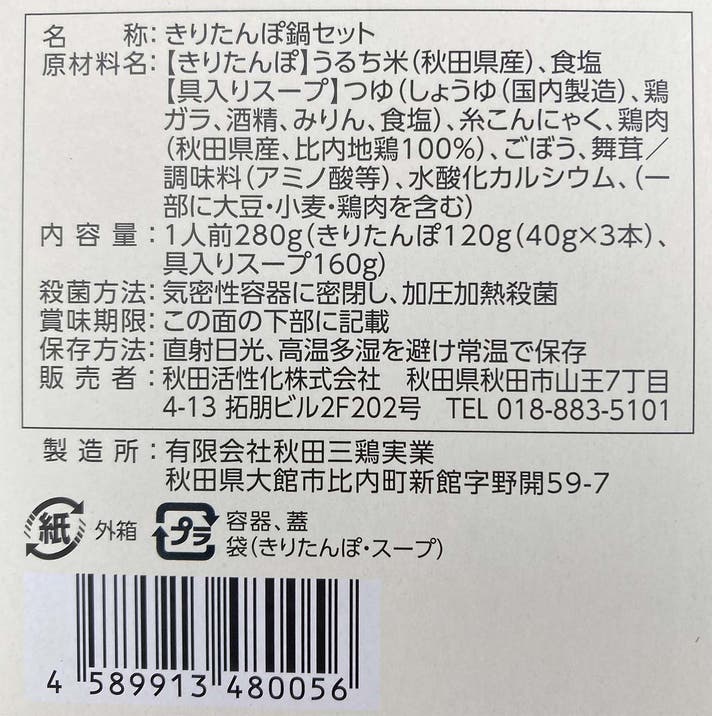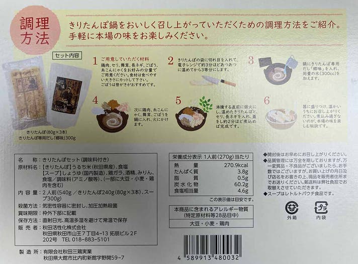 内容量:2人前(540g/きりたんぽ240g(80g×3本)、スープ300g)。