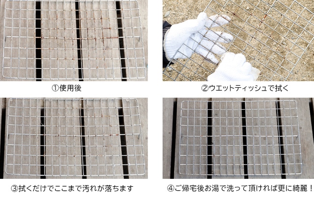 火が出ず焦げにくい特性で網のお手入れはウェットティッシュで軽くふくだけ!簡単に片付けられます!