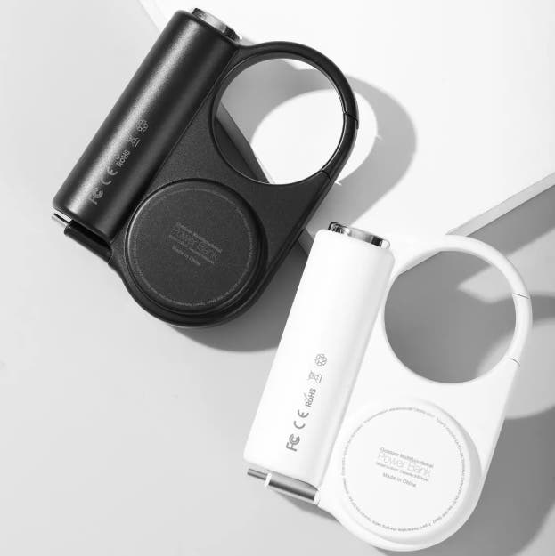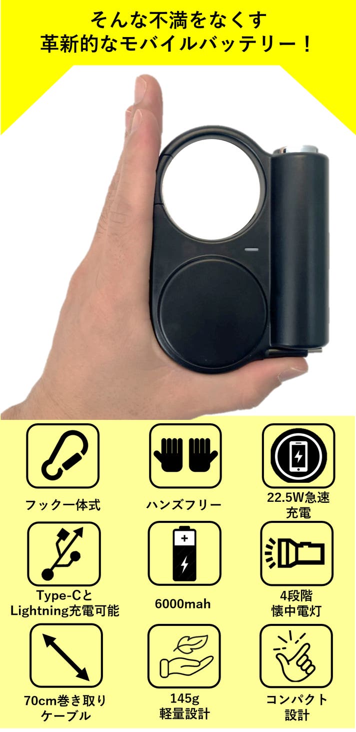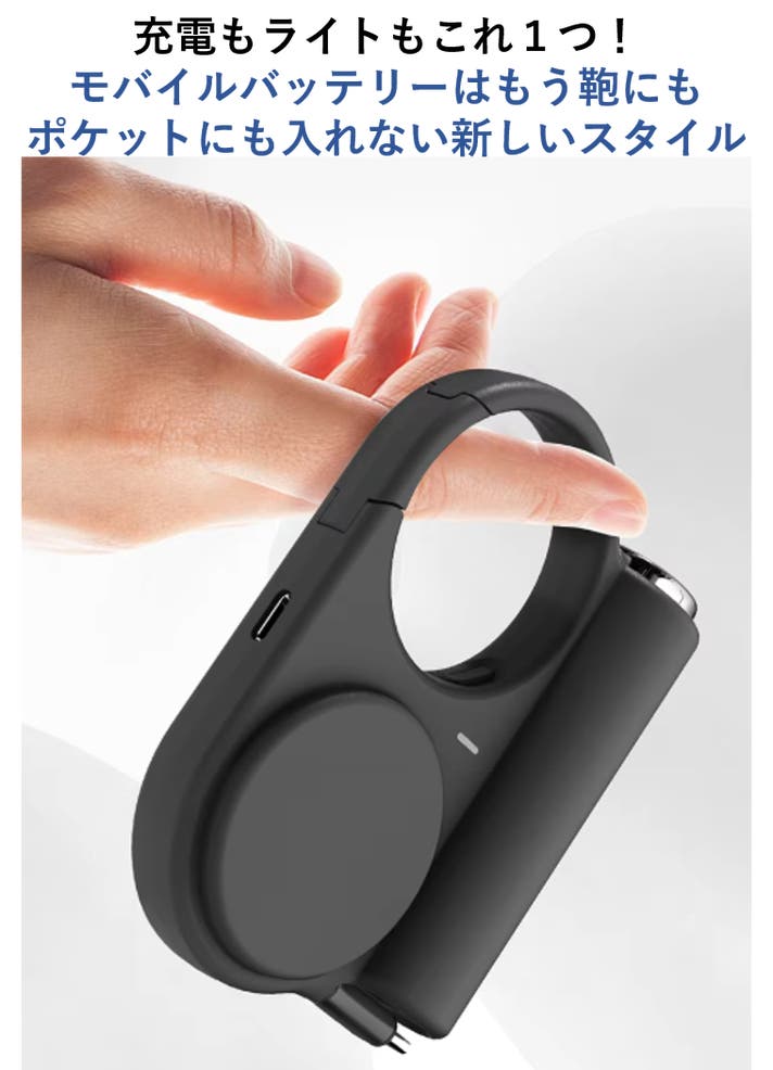 バッテリー本体とカラビナを一体式で作成しており、フックによってバックパック、ベルト、ショルダーバッグなどに簡単に掛けられます。これで、重たいモバイルバッテリーに両手が縛られることはありません。
