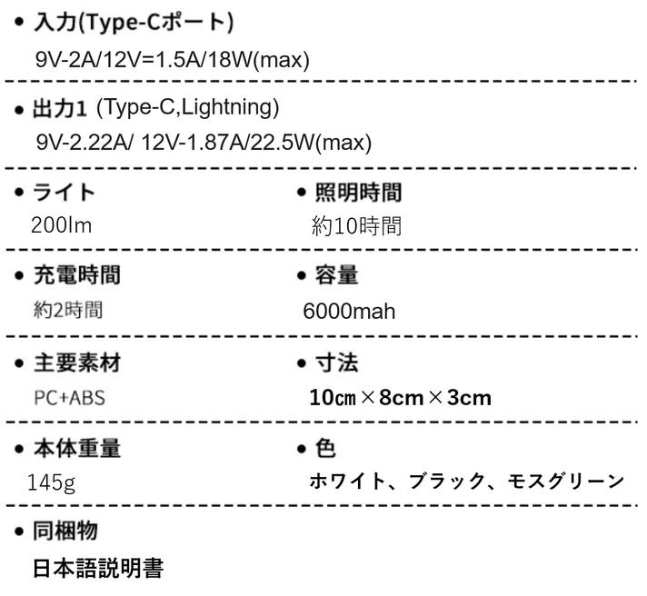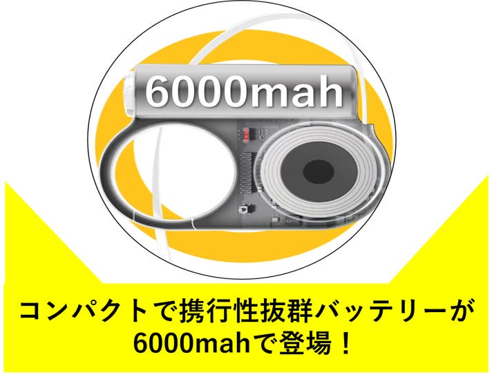- 6,000mAhのパワフルバッテリーで、スマホ約2回分の充電ができ、長時間の外出に対応。