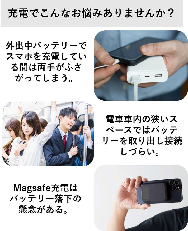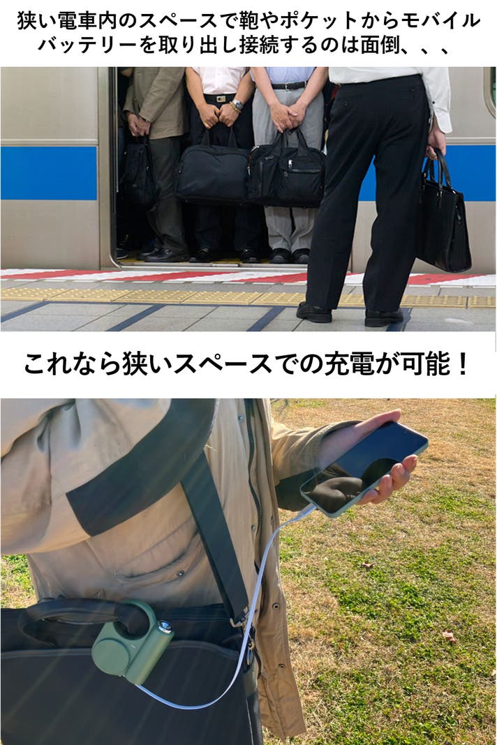 通勤時のバッグにも取り付けることが出来、狭い電車内で鞄をごそごそ探す手間がいらずに充電を開始することが出来ます。