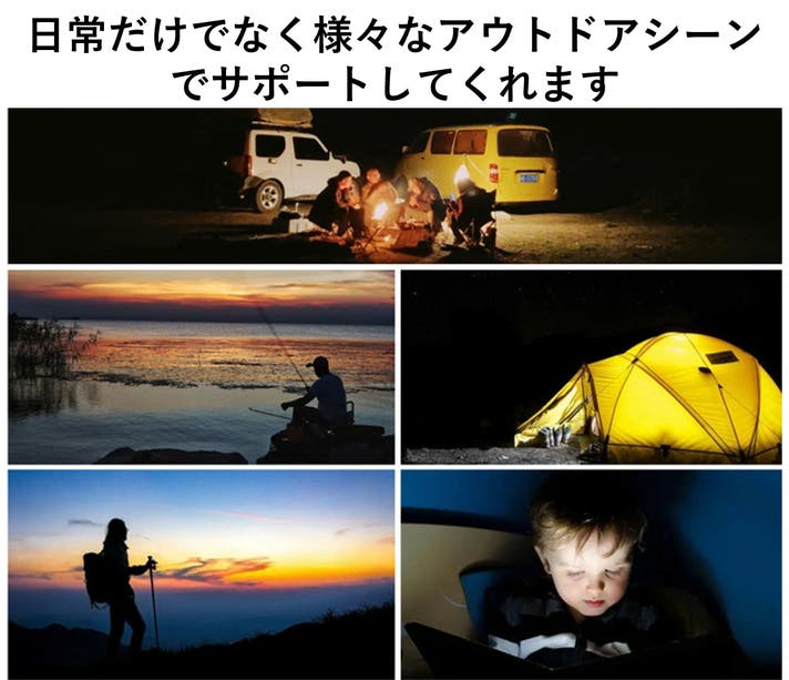- 4段階のライトを内蔵。10時間連続使用可能で、アウトドアのみならず、突然の停電時に最適。
