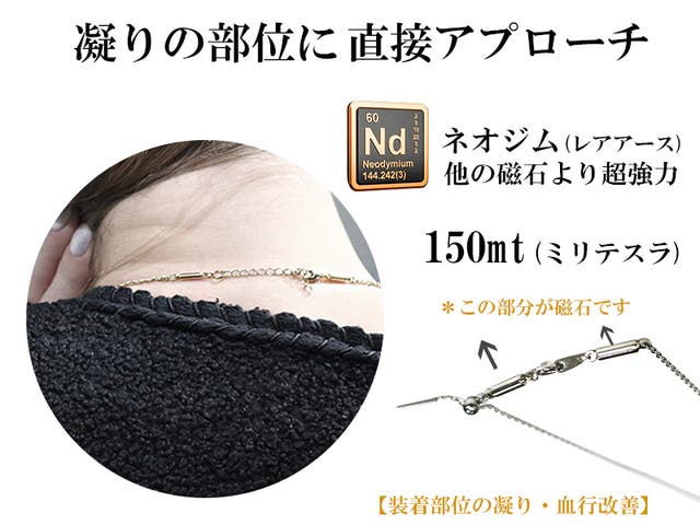 そこで私たちは健康と美しさを追求する人々のために、現代病(ストレートネック)の原因である【血行】【凝り】を改善する磁気ネックレスを開発しました。このネックレスは、自然(磁力)の力を活用して凝り・血行の改善を促し、健康的な生活をサポートします。
