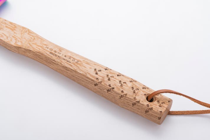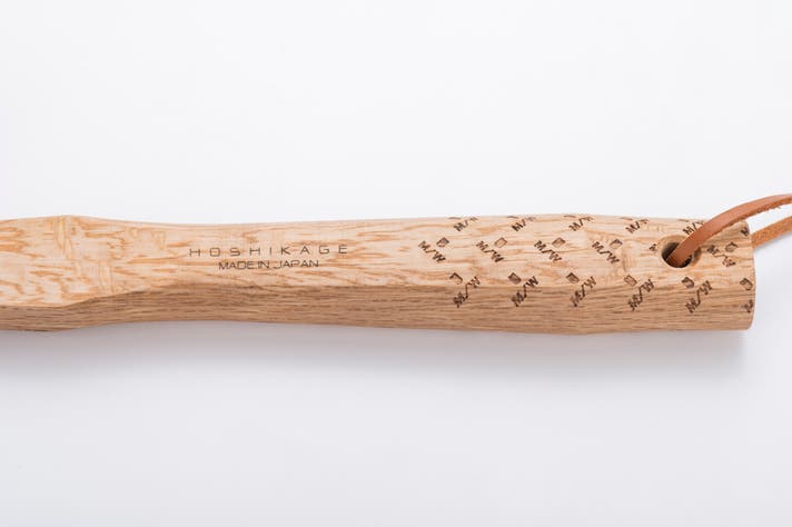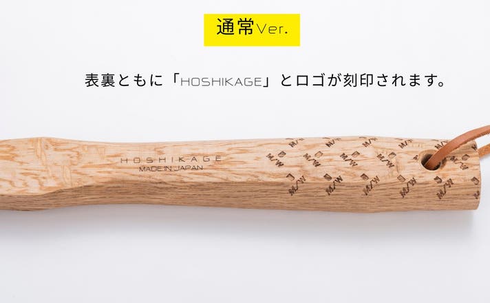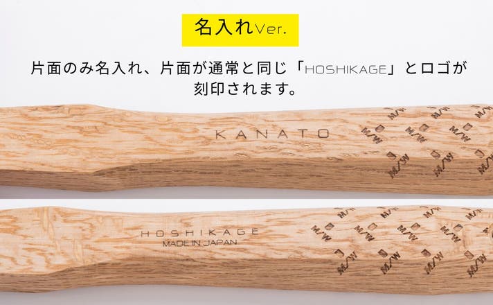 細字で刻印された「HOSHIKAGE」の文字が、白カシ特有の美しい木目と調和。木目は一本一本異なり、銀河のまだら模様や星の軌跡のような表情を見せてくれます。