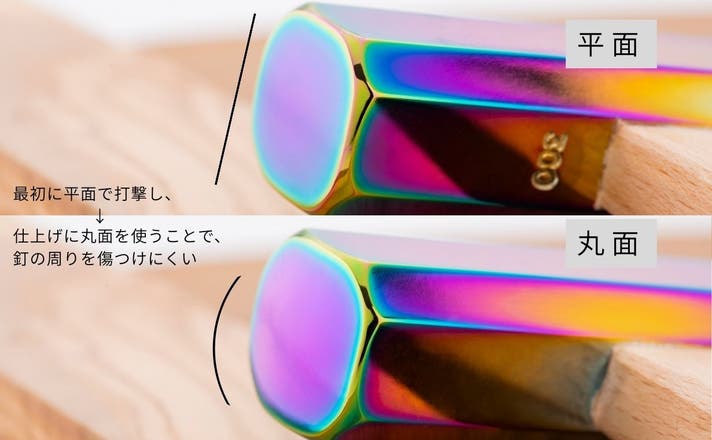 平面と丸面の八角形ヘッド。平面は釘打ちや部材の固定に、丸面は仕上げ用として木材に跡を残しにくく、美しい仕上がりを実現します。1本で打つ作業と仕上げ作業を切り替えられる万能タイプです。