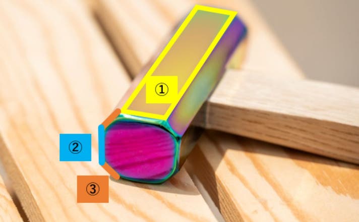 面があることで打面の向きがわかりやすく、狙った位置へ真下方向にまっすぐ打つことができます。振り下ろした力が無駄なくハンマーヘッドに伝わり、軽い力でも安定した打撃が可能。