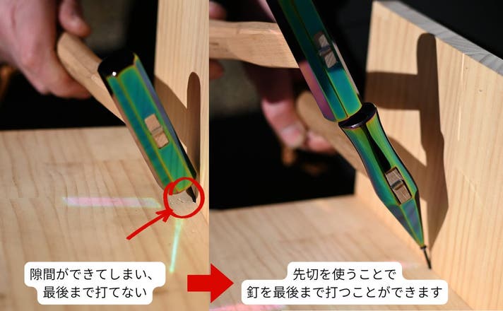 平面と釘締めを備えたヘッド。釘をさらに沈めることで接合強度を高められるので、家具補強や下地材の取り付けなど、強度や耐久性を重視する作業に最適です。
