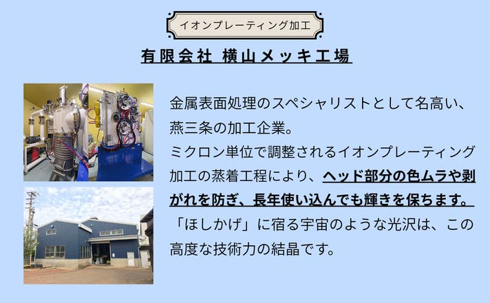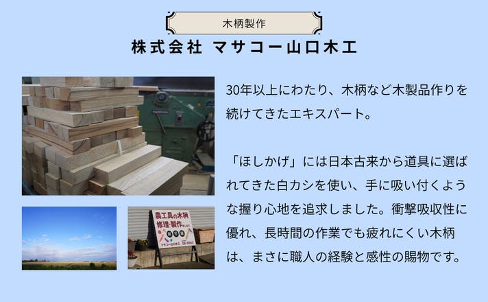 「ほしかげ」は、燕三条で活躍する4つの専門企業が協力して作り上げました。ヘッド製作から加工、木柄、刻印それぞれの分野のプロが担当しています。
