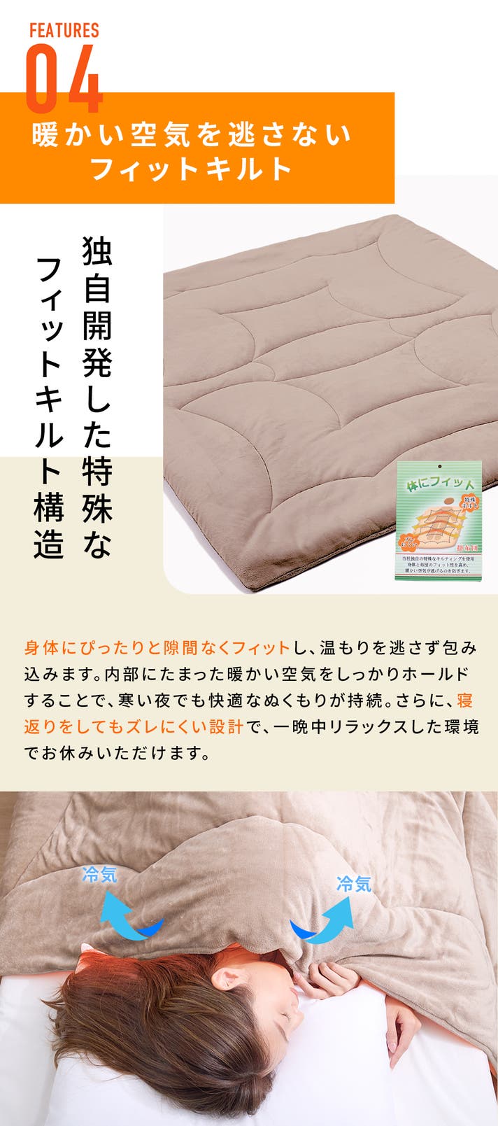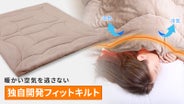一般的なふとんのキルトは襟元やふとん四隅から冷たい空気が入ったり、寝ている間にズレてしまうことがありますが、フィットキルトは、身体の幅に沿って設計されておりやわらかくドレープ感があります。襟元やふとんの四角が自然と沈み込むので隙間なく身体にフィット。暖かい空気を逃さずズレにくい仕様になっています。