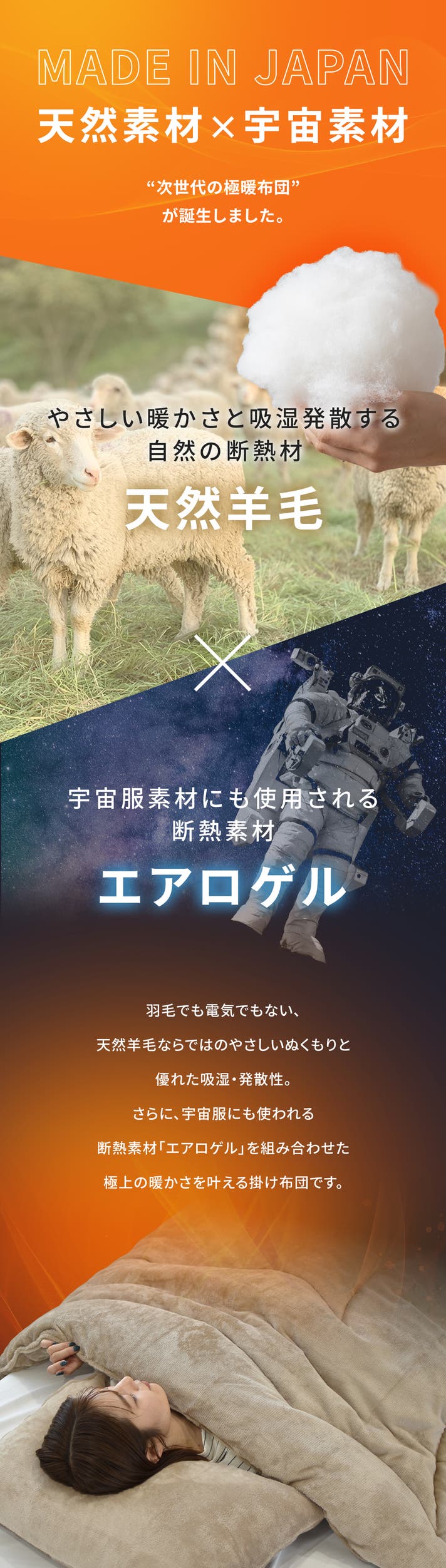 - 天然素材の羊毛×宇宙服素材「エアロゲル」で、極暖布団革命。極寒アウトドアにも最適!
