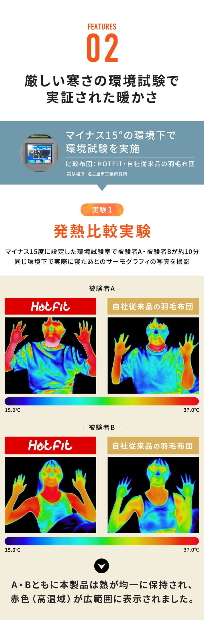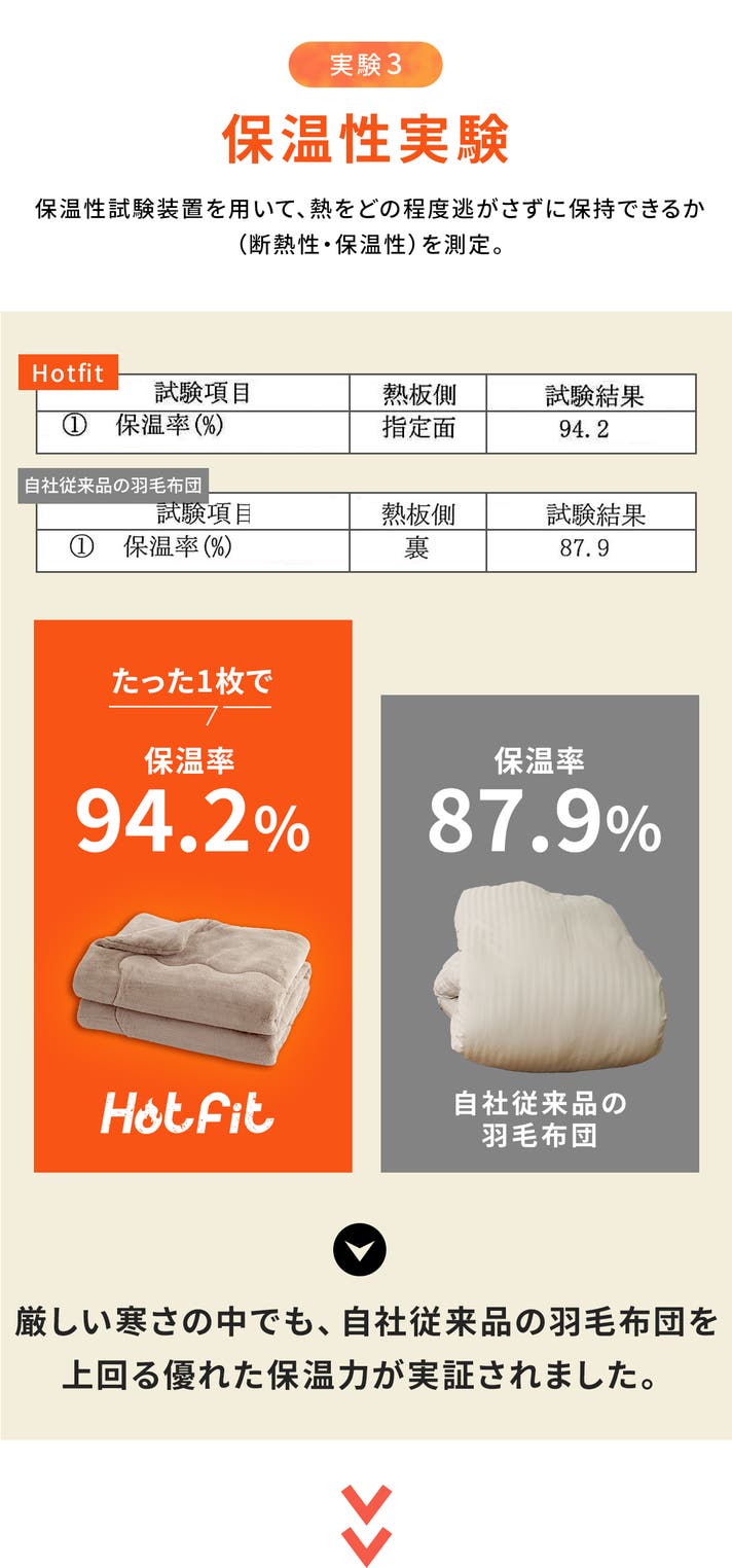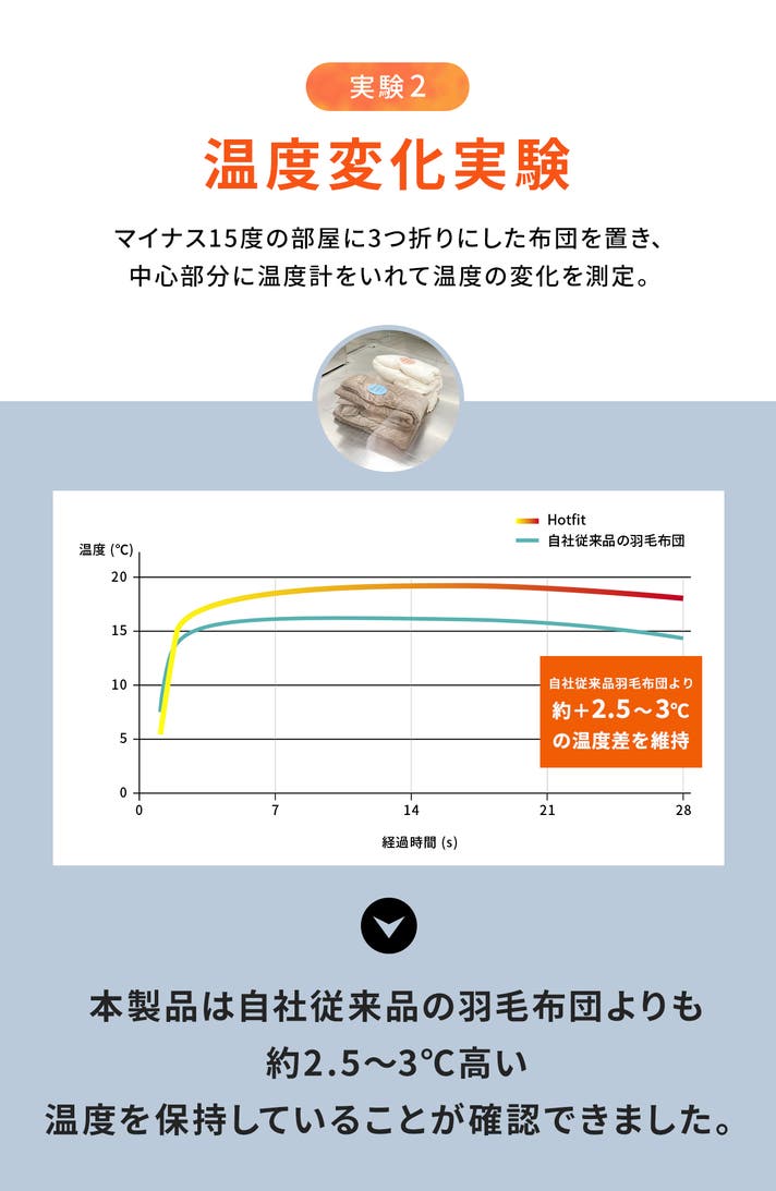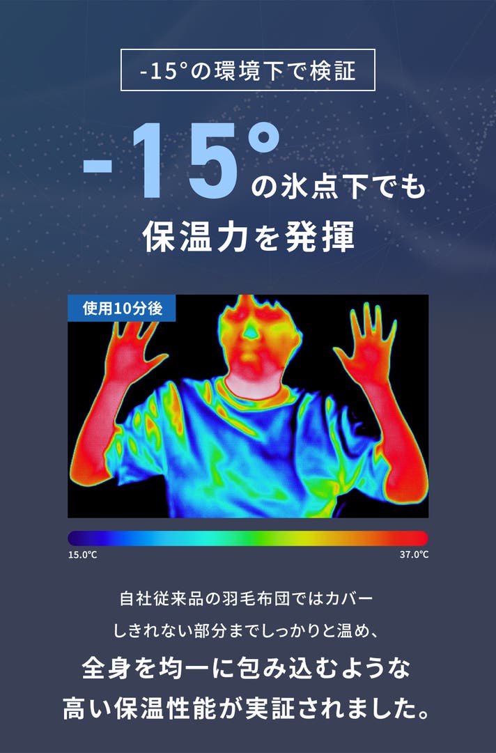 つまり、羽毛布団では均一に保ちきれない熱をしっかりと保持し、全身を包み込むような暖かさを持続させることが実証されました。