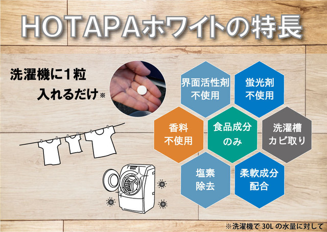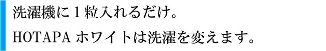 衣類は長時間肌に直接触れるもの・・・だから口に入れても安全な食品成分だけで開発をスタートし、粉を固形にしても水に溶けるという課題をクリアするために多くの時間を費やして、HOTAPAランドリーをさらに進化させた商品がHOTAPAホワイトです。