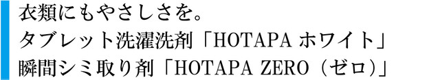 日常生活を送る上で、「除菌」というキーワードを耳にする機会が多くなっておりますが、「抗菌」ということまで考えて作られた商品が「HOTAPA」になります。今回のプロジェクトで「衣類にもやさしさ」を実現するために、タブレット洗濯洗剤HOTAPAホワイト、瞬間シミ取り剤HOTAPA ZEROが誕生します。もちろん食品成分です。