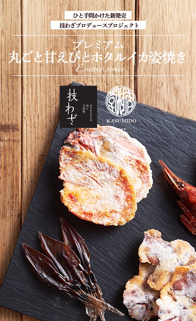 - 姿焼き煎餅にするにはもったいないランクの良質な甘えびとホタルイカを使用してつくります。