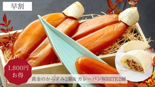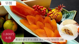 黄金のからすみ2箱(1腹入り×2箱)に、日本料理「瀬戸内」が手掛ける当ホテル人気のカレーパン「カレーパンFIVE」のWHITE(すきやき風煮込み)が2個ついた早割でしか手に入らないセットです。