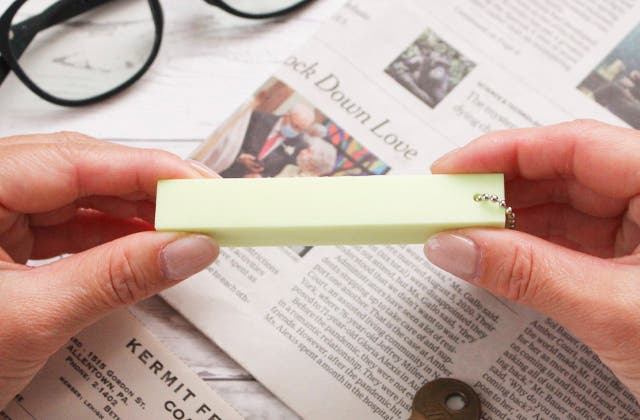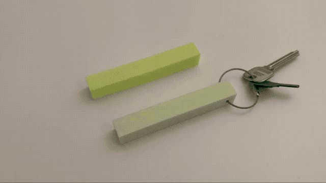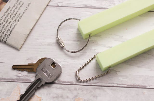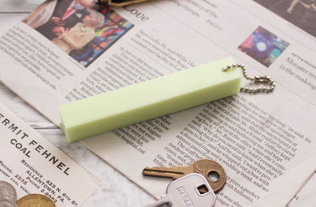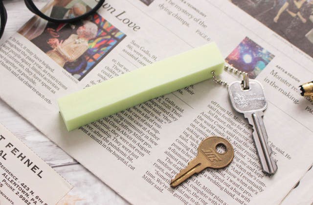 宿泊したホテルの鍵が、懐かしいレトロなアクリル製キーホルダーだったのをヒントに、これを蓄光素材で作ったら、とても光るし面白いのでは!?と思ったのが開発のきっかけです。存在感があり大きく鍵をなくすこともない形だと思います。
